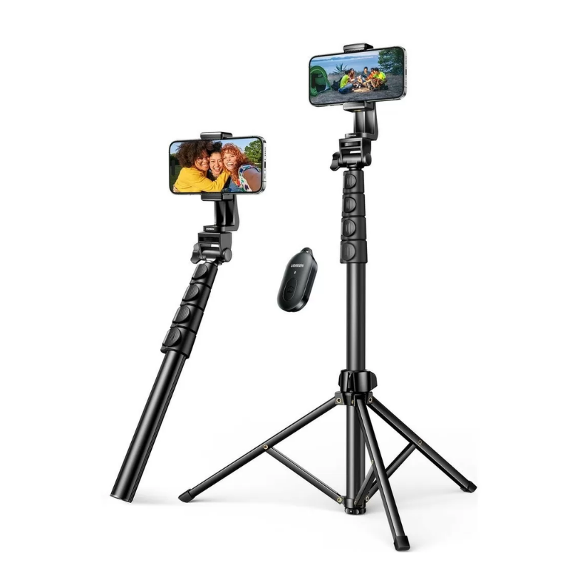 - El UGREEN Selfie stick y el chóte de moto de celular con control remoto está hecho de fuerte aleación de aluminio fuerte, por lo que es extremadamente resistente. Pesa 13 oz y es fácil de llevar. Sostiene los teléfonos de hasta 6.8o y cualquier cámara compatible con tornillo de .25 pulgadas.